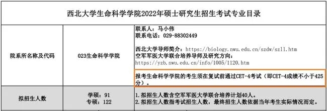 西北大学招生目录具体要求中明确表示:报考生命科学学院的考生须在复试前通过CET-4考试(即CET-4成绩不小于425)。